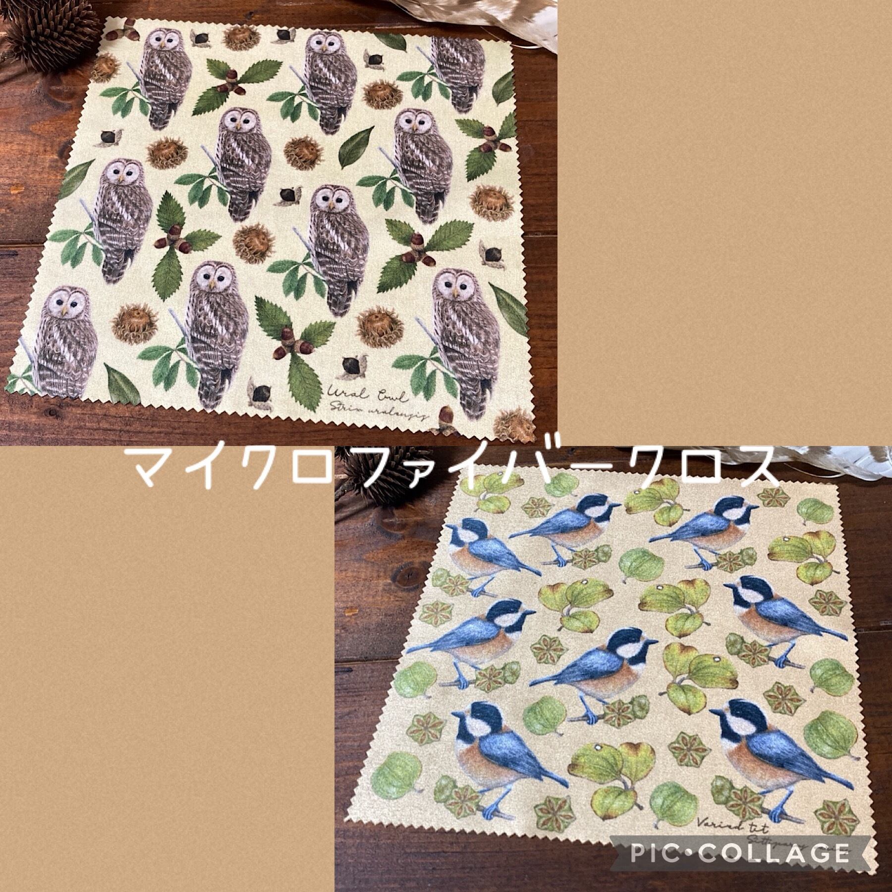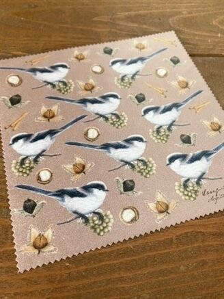 カラ類(コガラ、エナガ、ヤマガラ)とフクロウと里山の木の実の柄のマイクロファイバークロス(メガネふき)です